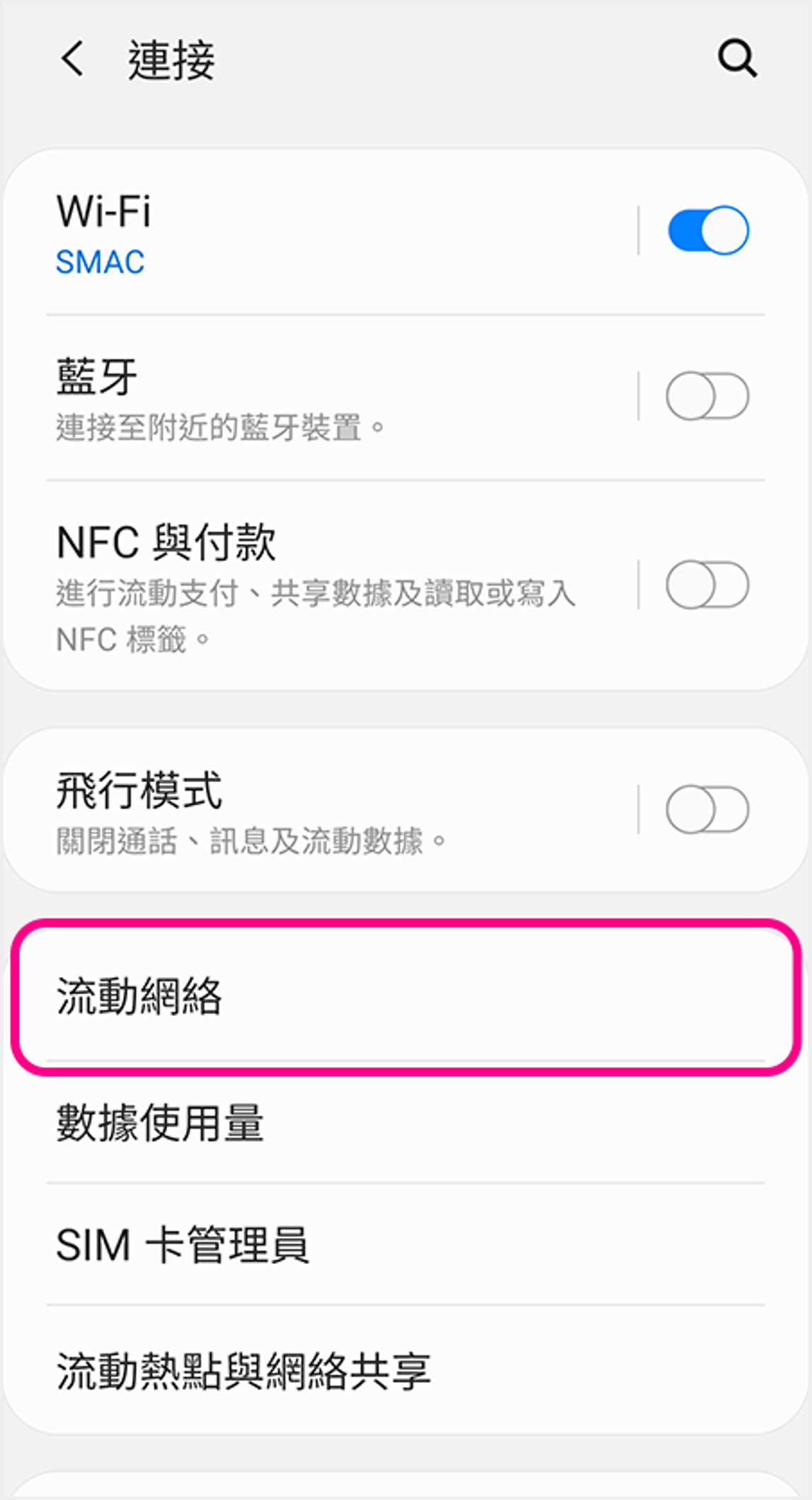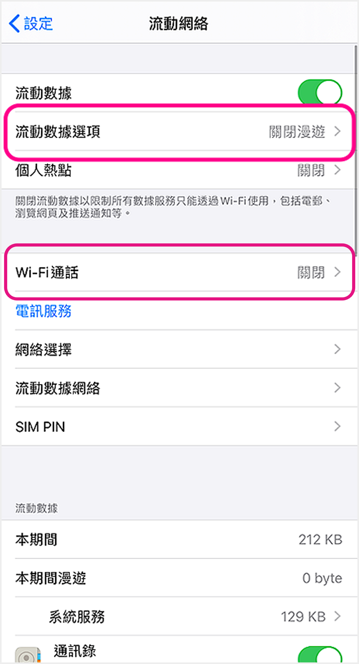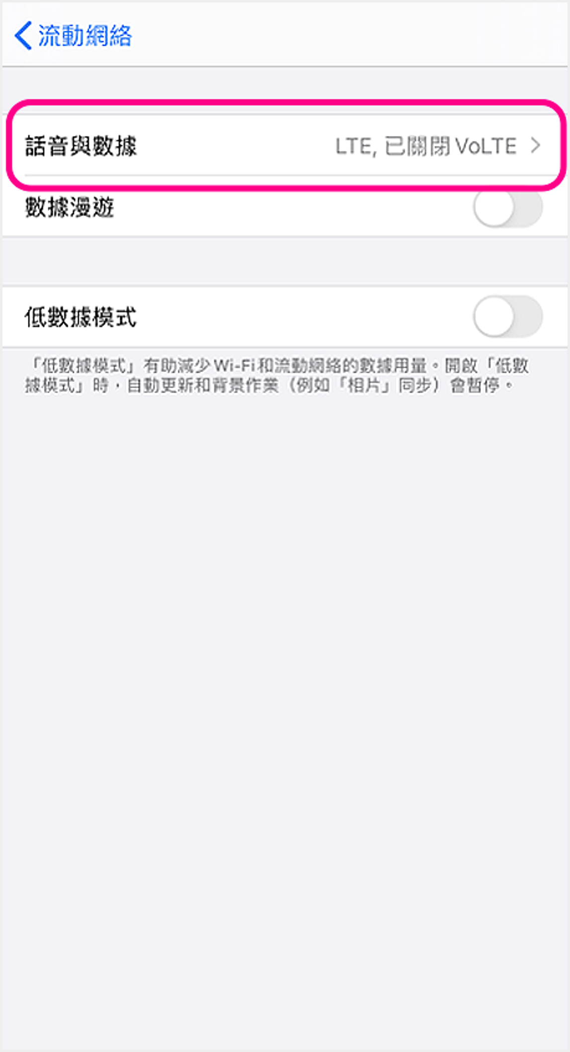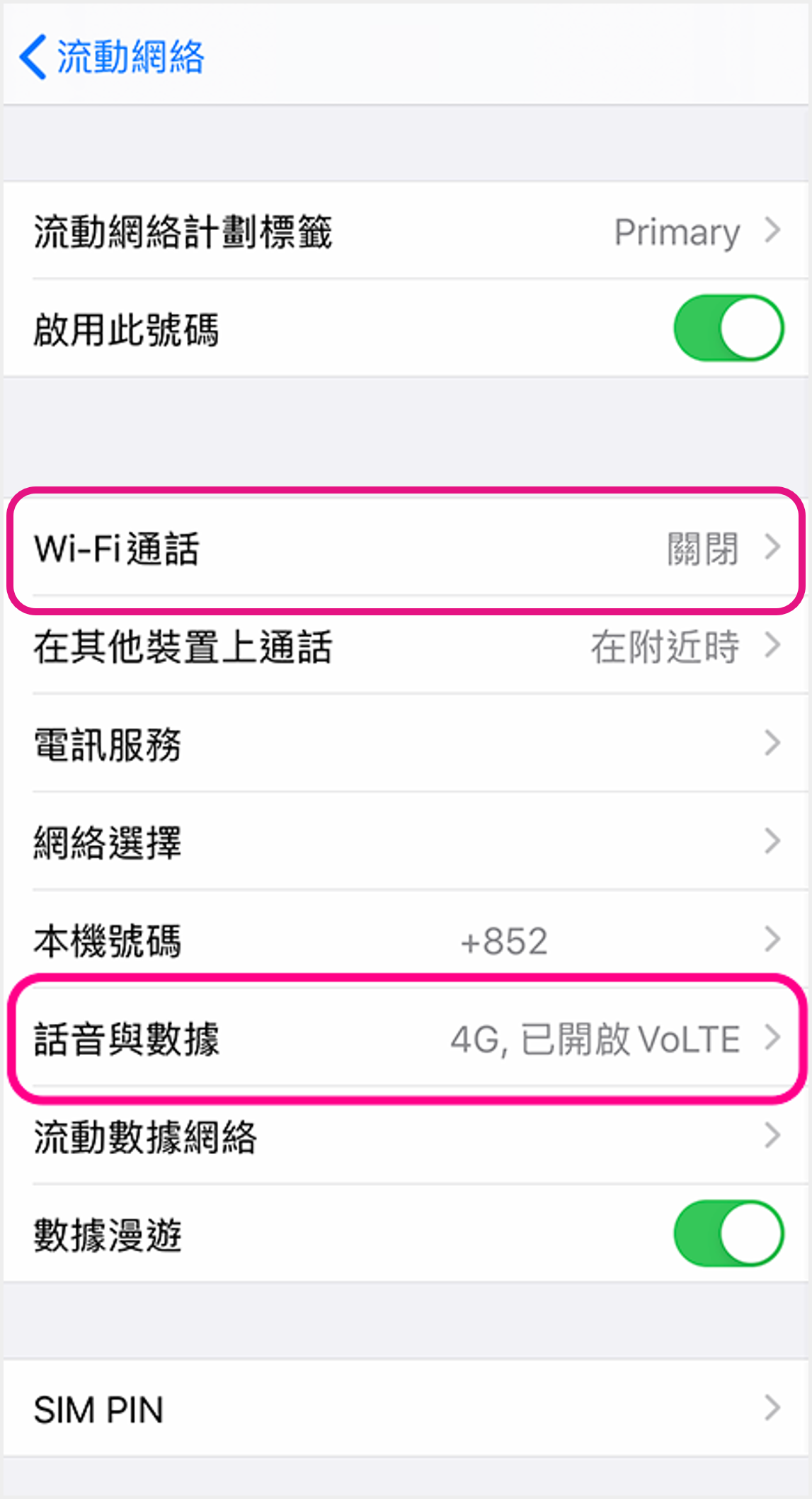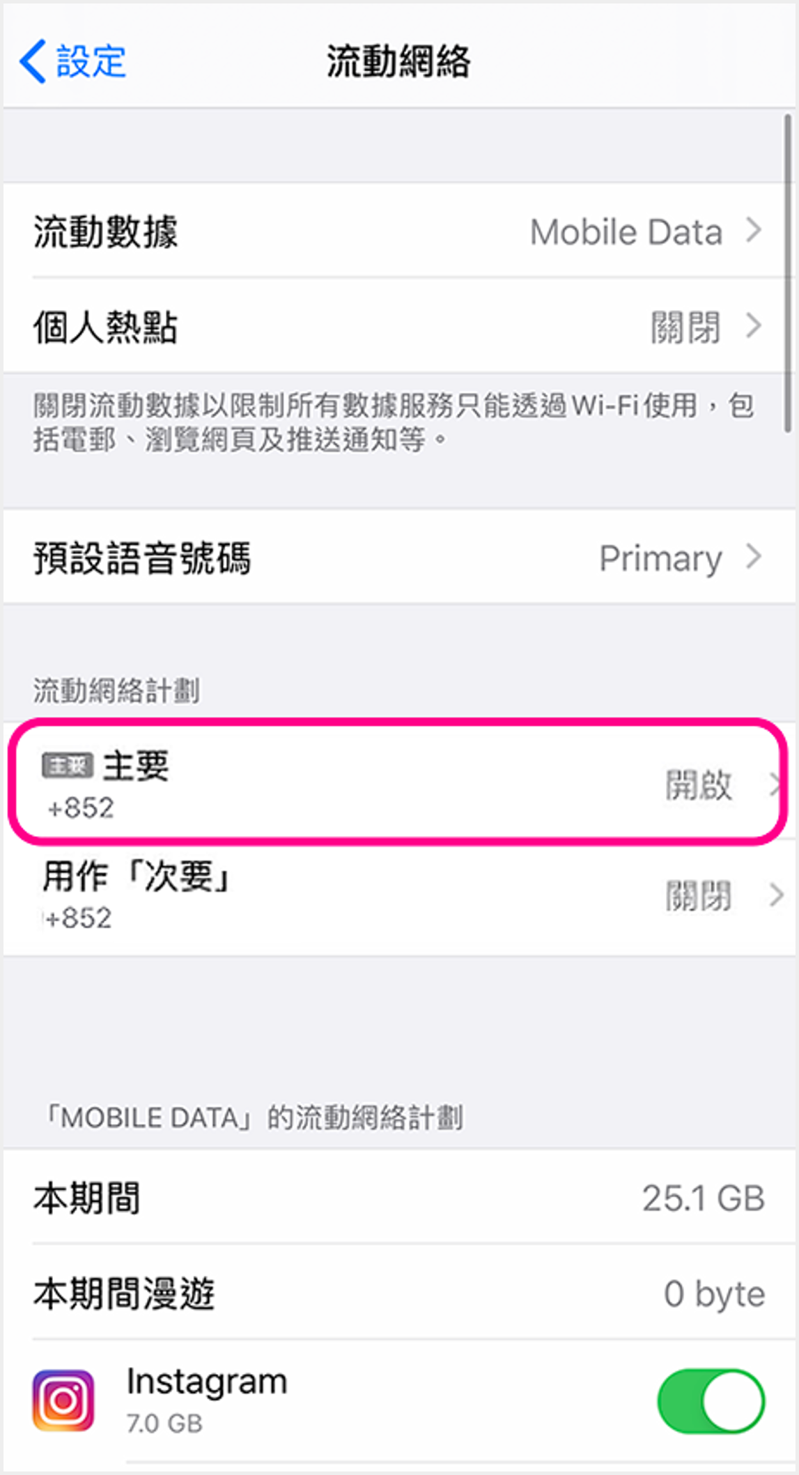 iOS (雙SIM卡) ![]() 1 進入裝置設定,點選「流動網絡」 ![]() 2 點選須開啟設定的SIM卡 ![]() 3 點選「話音與數據」