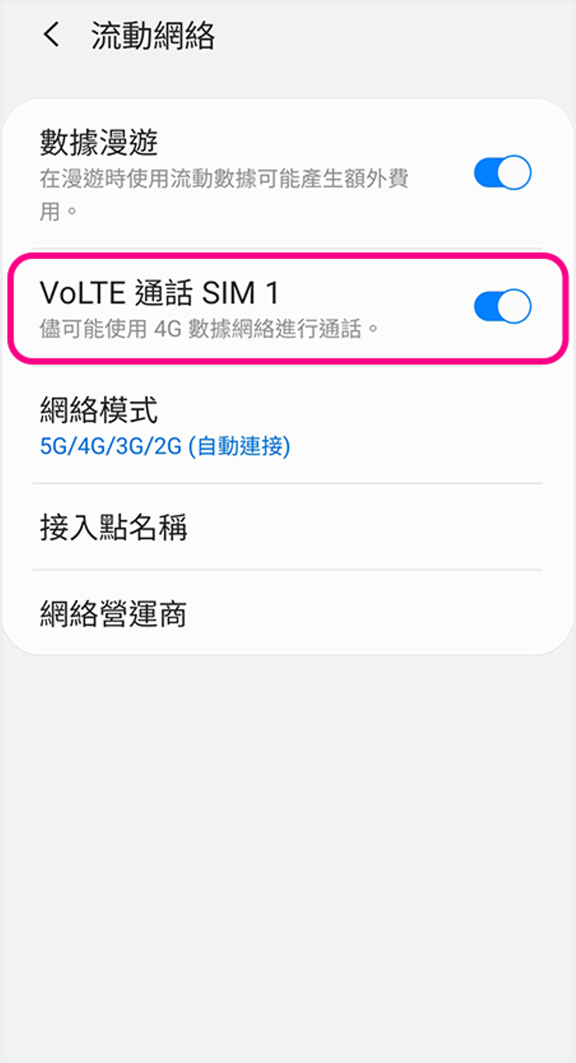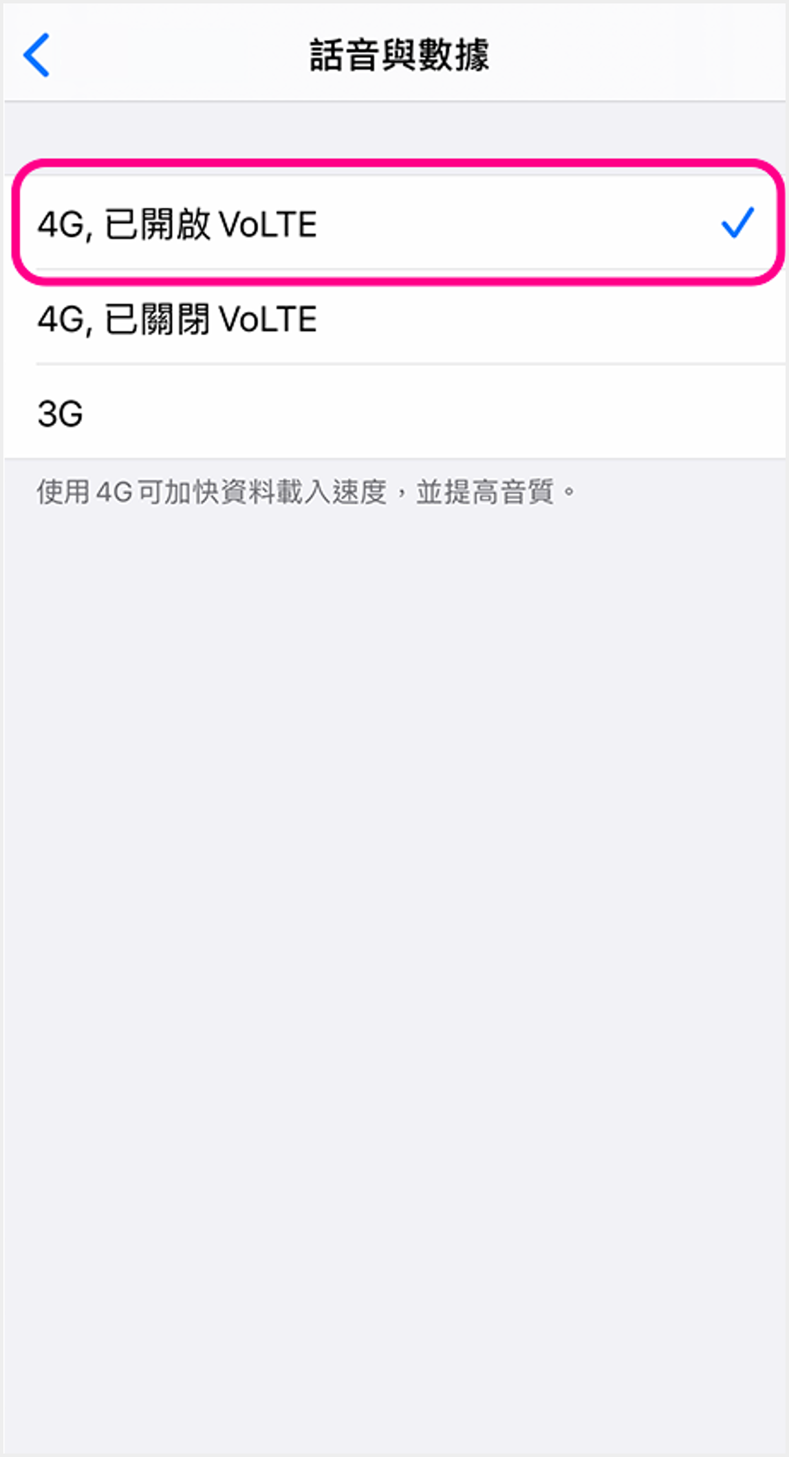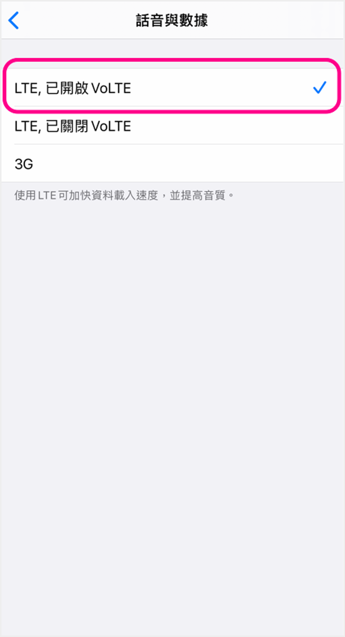 ![]() 4 點選「已開啟VoLTE」即可啟用VoLTE |