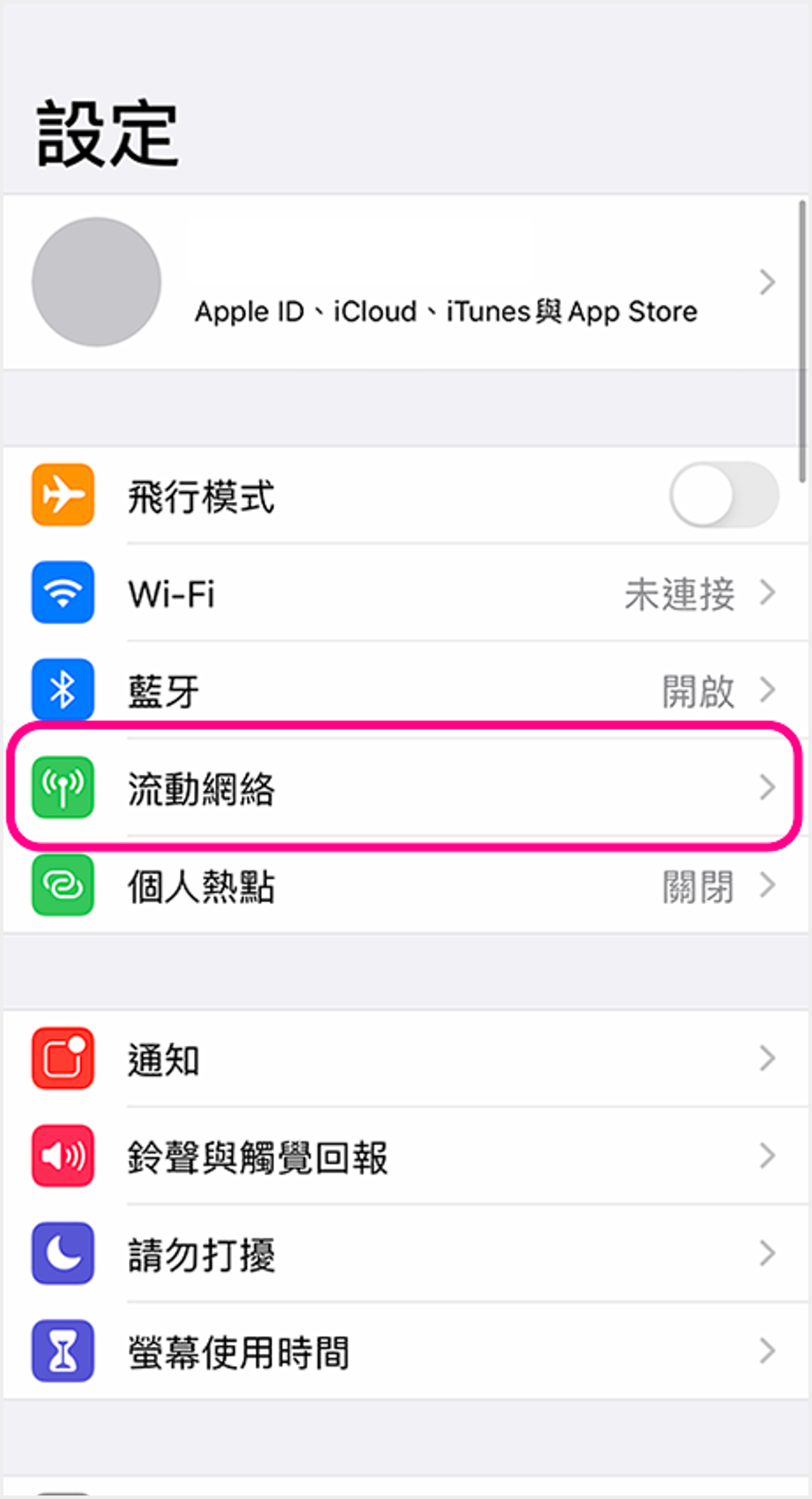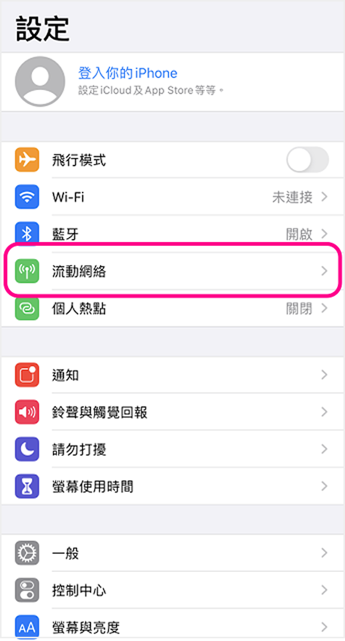 iOS (單SIM卡) ![]() 1 進入裝置設定,點選「流動網絡」 ![]() 2 點選「流動數據選項」